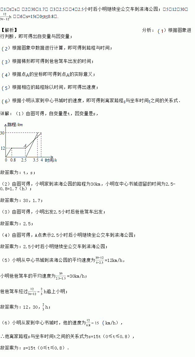 ÖÜÄ©£¬Ð¡Ã÷×ø¹«½»³µµ½±õº£¹«Ô°ÓÎÍæ£¬Ëû´Ó¼Ò³ö·¢0.8Сʱºó´ïµ½ÖÐÐÄÊé³Ç£¬¶ºÁôÒ»¶Îʱ¼äºó¼ÌÐø×ø¹«½»³µµ½±õº£¹«Ô°£¬Ð¡Ã÷Àë¼ÒÒ»¶Îʱ¼äºó£¬°Ö°Ö¼Ý³µÑØÏàͬµÄ·ÏßǰÍùº£±õ¹«Ô°. ÈçͼÊÇËûÃÇÀë¼Ò·³Ìs£¨km£©ÓëСÃ÷Àë¼Òʱ¼ät£¨h£©µÄ¹ØÏµÍ¼£¬Çë¸ù¾Ýͼ»Ø´ðÏÂÁÐÎÊÌ⣺
