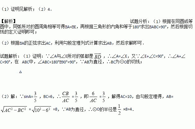 如图,在⊙O中,AB为直径,D.E为圆上两点,C为圆外一点,且∠E+∠C=90°.