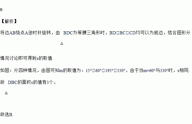 △ABC中,AB=AC,∠BAC=30°,将AB绕着点A逆时针旋转m°(0<m<360)至AD,连BD,CD,且△DBC为等腰三角形,设△DBC的面积为s,则s的值有( )个.