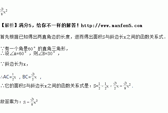 有一个角是60°的直角三角形,它的面积S与斜边长x之间的函数关系式是________.