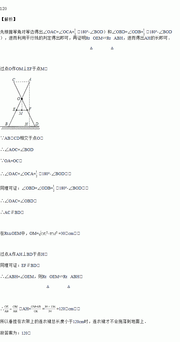 小红家的阳台上放置了一个晒衣架如图①.图②是晒衣架的侧面示意图,立杆AB,CD相交于点O,B,D两点立于地面.经测量:AB=CD=136 cm,OA=OC=51 cm,OE=OF=34 cm,现将晒衣架完全稳固张开,扣链EF成一条线段,且EF=32 cm.垂挂在衣架上的连衣裙总长度小于________cm时,连衣裙才不会拖落到地面上.