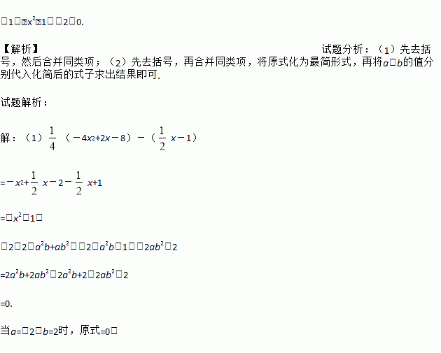 (1)﹣x2﹣1;(2)0. 【解析】试题分析:(1)先去括号,然后合并同类项;(2)先去括号,再合并同类项,将原式化为最简形式,再将a、b的值分别代入化简后的式子求出结果即可. 试题解析: 【解析】 (1)(-4x2+2x-8)-(x-1) =-x2+x-2-x+1 =-x2-1; (2)2(a2b+ab2)-2(a2b-1)-2ab2-2 =2a2b...计算: