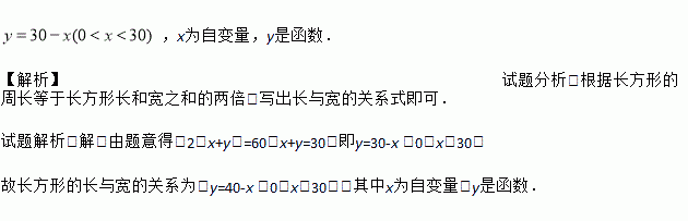 已知一个长方形周长为60米.求它的长y(米)与宽x(米)之间的函数关系式,并指出关系式中的自变量与函数