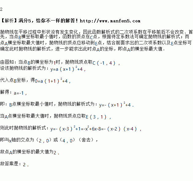 如图,一条抛物线与轴的交点为、两点,其顶点在折线上运动.若、、的坐标分别为、、、,点横坐标的最小值为,则点横坐标的最大值为________.