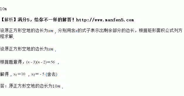 公园原有一块正方形空地,后来从这块空地上划出部分区域栽种鲜花(阴影部分),原空地一边减少了3m,另一边减少了2m,剩余空地面积为56m2,求原正方形空地的边长.
