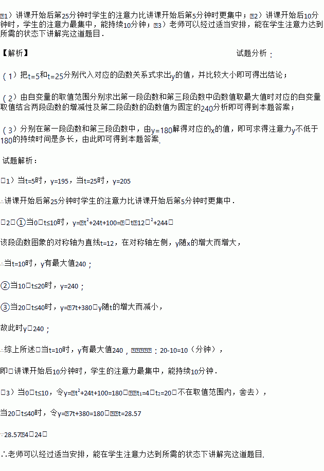 (1)讲课开始后第25分钟时学生的注意力比讲课开始后第5分钟时更集中;(2)讲课开始后10分钟时,学生的注意力最集中,能持续10分钟;(3)老师可以经过适当安排,能在学生注意力达到所需的状态下讲解完这道题目. 【解析】试题分析: (1)把t=5和t=25分别代入对应的函数关系式求出y的值,并比较大小即可得出结论; (2)由自变量的取值范围分别求出第一段函数和第三段函数中函数值取最...