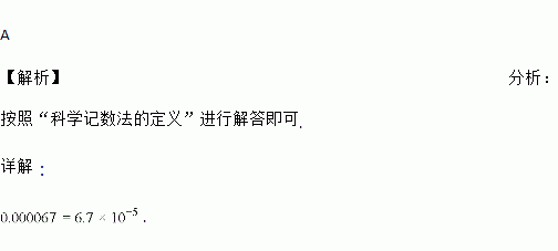 某种细胞的直径是0.000067厘米,将0.000067用科学记数法表示为( )