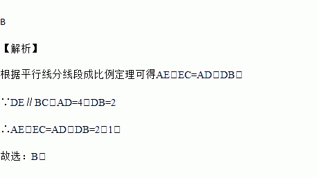如图,在△ABC中,DE∥BC,若AD=4,BD=2,则AE:CE的值为( )