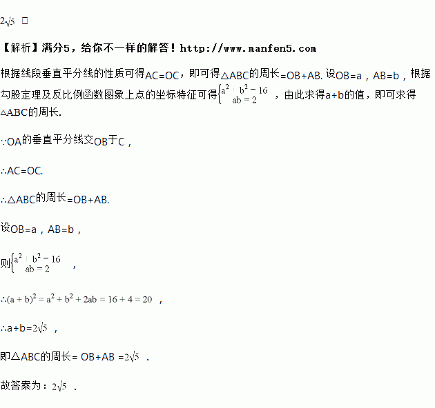 如图,已知反比例函数y=在第一象限内的图象上一点A,且OA=4,AB⊥x轴,垂足为B,线段OA的垂直平分线交x轴于点C(点C在点B的左侧),则△ABC的周长等于_____.
