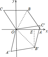 分析:首先连接OB,OB′,过点B′作B′E⊥x轴于E,由旋转的性质,易得∠BOB′=105°,由菱形的性质,易证得△AOB是等边三角形,即可得OB′=OB=OA=2,∠AOB=60°,继而可求得∠AOB′=45°,由等腰直角三角形的性质,即可求得答案.
