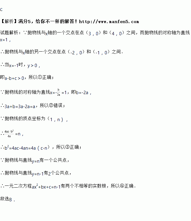如图是抛物线y=ax2+bx+c(a≠0)的部分图象,其顶点是(1,n),且与x的一个交点在点(3,0)和(4,0)之间,则下列结论:①a-b+c>0;②3a+b=0;③b2=4a(c-n);④一元二次方程ax2+bx+c=n-1有两个不等的实数根.其中正确结论的个数是( )