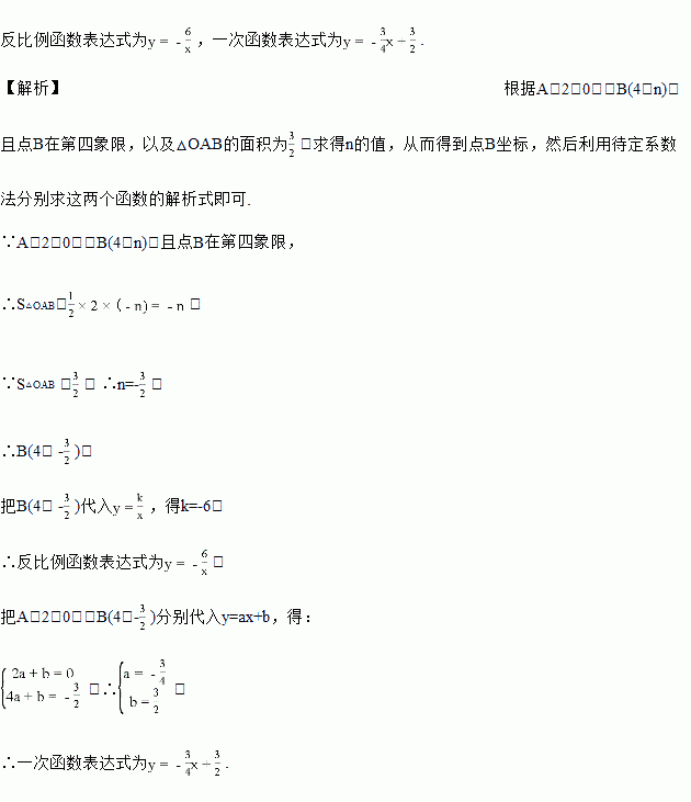 如图,一次函数y=ax+b的图象经过点A(2,0),与反比例函数的图象在第四象限交于点B(4,n),△OAB的面积为,求一次函数和反比例函数的表达式.