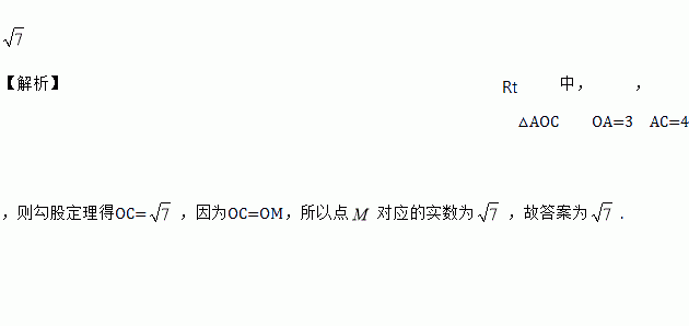 如图, 为数轴的原点, 两点分别对应,作腰长为4的等腰⊿,连接,以为圆心, 为半径画弧交数轴于点,则点对应的实数为 ________ .