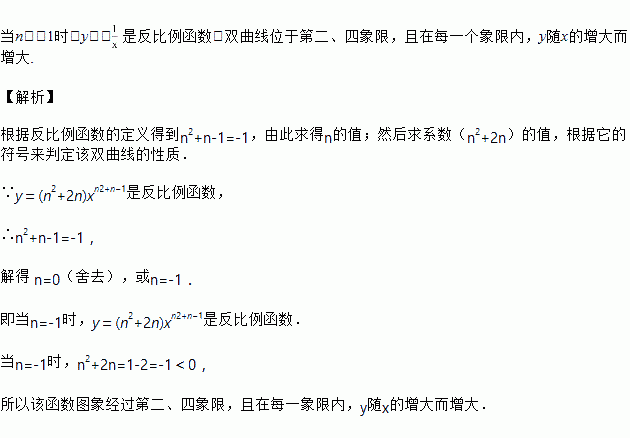 当n取什么值时,y=(n2+2n)xn2+n-1是反比例函数?它的图象在第几象限内?在每个象限内,y随x的变化而变化的情况怎样?