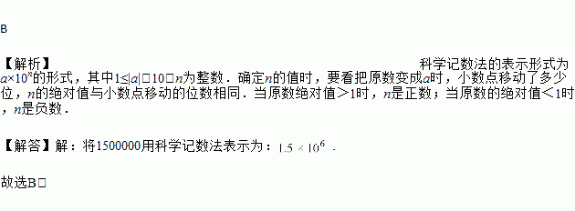 2018年5月25日,中国探月工程的“鹊桥号”中继星成功运行于地月拉格朗日点,它距离地球约.数1500000用科学记数法表示为( )