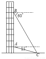 从一幢建筑大楼的两个观察点A,B观察地面的花坛(点C),测得俯角分别为15°和60°,如图,直线AB 与地面垂直,AB=50米,试求出点B到点C的距离.(结果保留根号)
