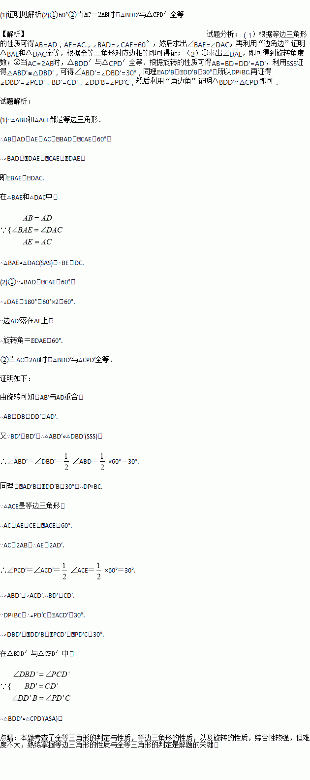 (2)如图②,将△ABD绕点A顺时针旋转得到△AB′D′.