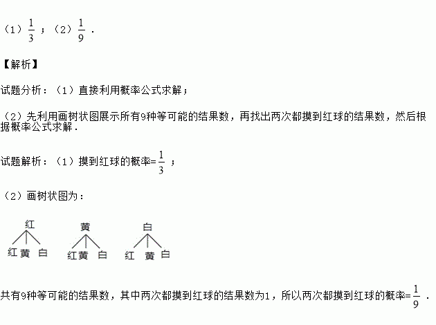 (1);(2). 【解析】 试题分析:(1)直接利用概率公式求解; (2)先利用画树状图展示所有9种等可能的结果数,再找出两次都摸到红球的结果数,然后根据概率公式求解. 试题解析:(1)摸到红球的概率=; (2)画树状图为: 共有9种等可能的结果数,其中两次都摸到红球的结果数为1,所以两次都摸到红球的概率=.