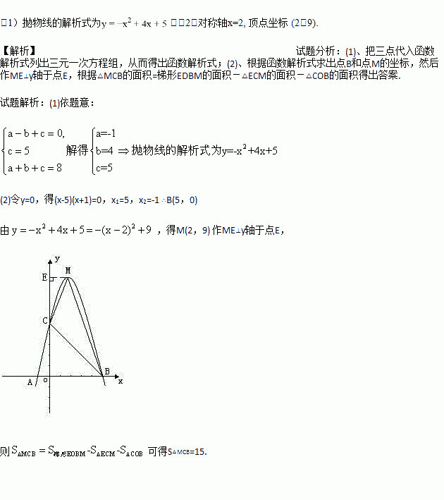 已知:如图,二次函数y=ax2+bx+c的图象与x轴交于A、B两点,其中A点坐标为(-1,0),点C(0,5),另抛物线经过点(1,8),M为它的顶点.