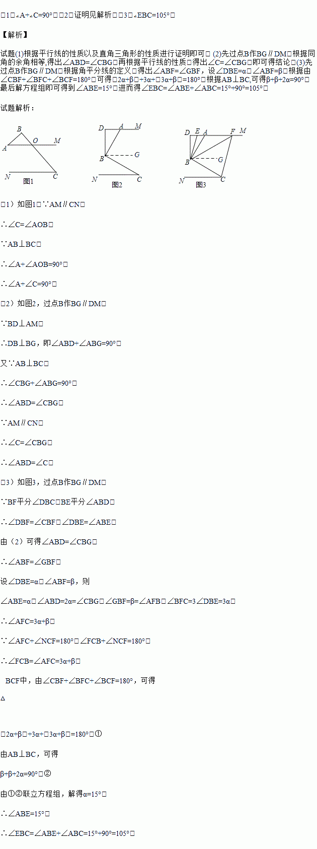 (3)如图3,在(2)问的条件下,点E、F在DM上,连接BE、BF、CF,BF平分∠DBC,BE平分∠ABD,若∠FCB+∠NCF=180°,∠BFC=3∠DBE,求∠EBC的度数.
