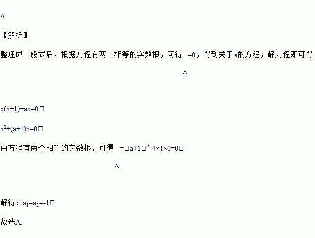 若关于的一元二次方程x(x+1)+ax=0有两个相等的实数根,则实数a的值为( )