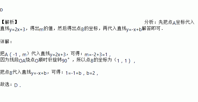 如图,在平面直角坐标系中,点A(-1,m)在直线y=2x+3上,连接OA,将线段OA绕点O顺时针旋转90°,点A的对应点B恰好落在直线y=-x+b上,则b的值为( )