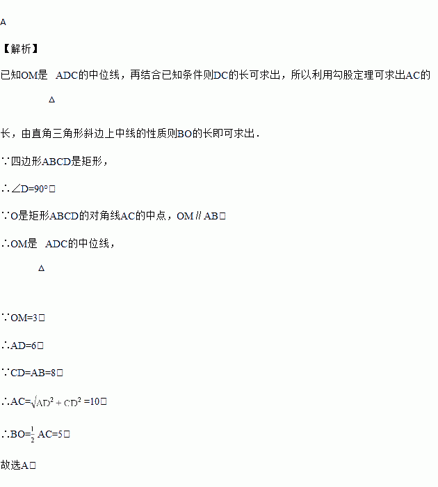 如图,点O是矩形ABCD的对角线AC的中点,M是CD边的中点.若AB=8,OM=3,则线段OB的长为( )