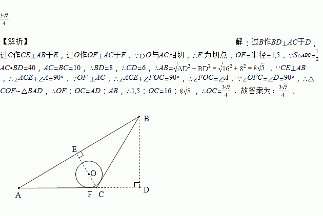 面积为40的△ABC中,AC=BC=10,∠ACB>90°,半径为1.5的⊙O与AC、BC都相切,则OC的长为_________.