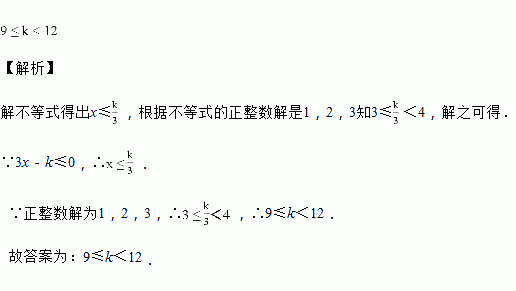 若不等式3x-k≤0的正整数解是1,2,3,则k的取值范围是________.