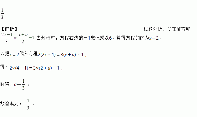 某人在解方程去分母时,方程右边的忘记乘以6,算得方程的解为,则a的值为______ .