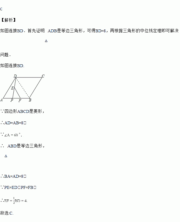 如图,在菱形中,,.是边上的一点,,分别是,的中点,则线段的长为( )