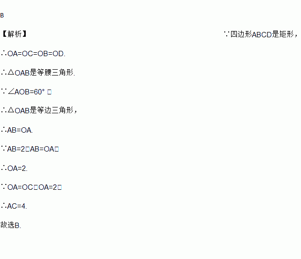如图,矩形ABCD的两条对角线相交于点O,∠AOB=60°,AB=2,则矩形的对角线AC的长是( )
