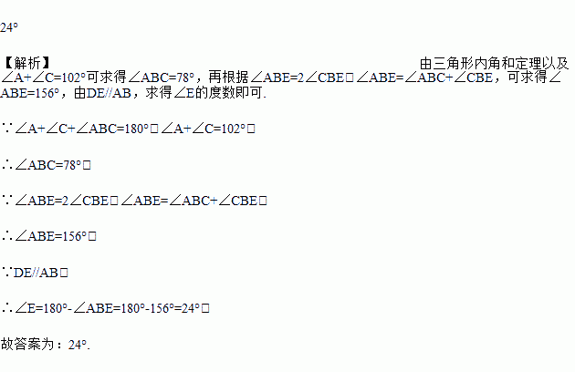 如图,已知∠A+∠C=102°,∠ABE=2∠CBE.若要使DE∥AB,则∠E的度数为________.