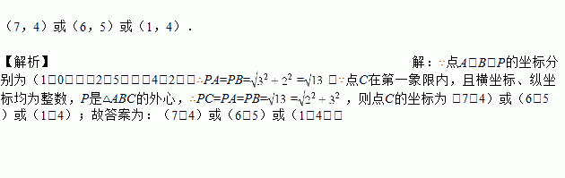 如图,在平面直角坐标系xOy中,点A、B、P的坐标分别为(1,0),(2,5),(4,2).若点C在第一象限内,且横坐标、纵坐标均为整数,P是△ABC的外心,则点C的坐标为______.
