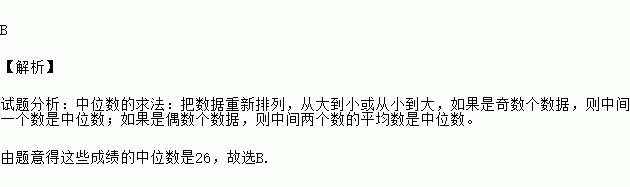 某校9名初中毕业生的中考体育考试成绩如下:25 26 26 26 26 27 28 29 29,这些成绩的中位数是( )