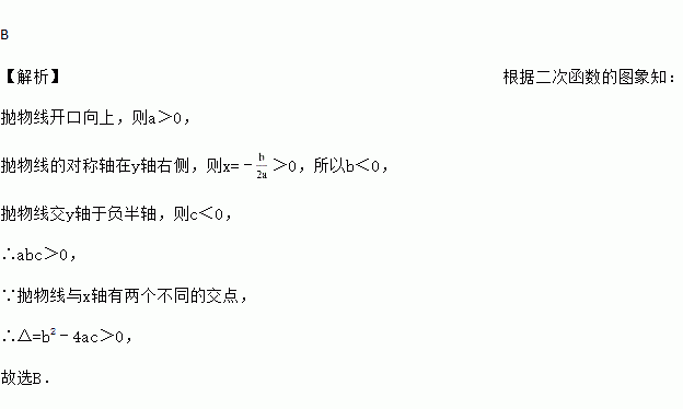 A. abc<0,b2–4ac>0 B. abc>0,b2–4ac>0 C. abc<0,b2–4ac<0 D. abc>0,b2–4ac<0