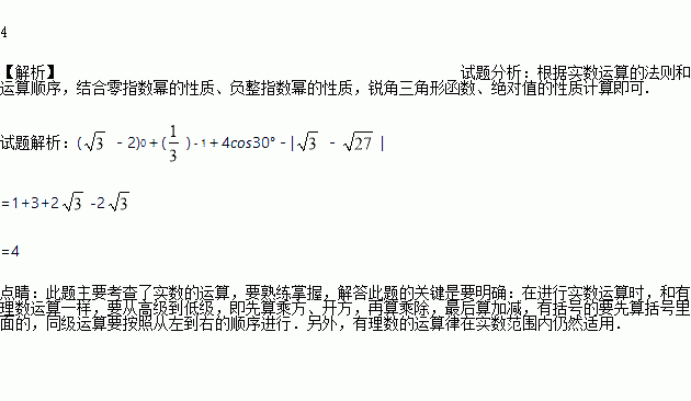 计算:(﹣2)0+()﹣1+4cos30°﹣|﹣|