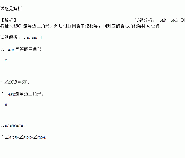 在圆O中,AB=AC,∠ACB=60°,求证:∠AOB=∠BOC=∠AOC.