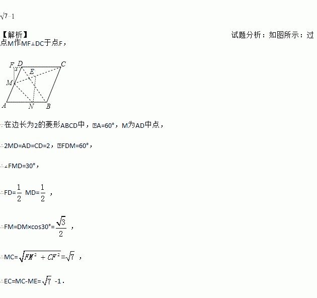 如图,在边长为2的菱形ABCD中,∠A=60°,点M是AD边的中点,连接MC,将菱形ABCD翻折,使点A落在线段CM上的点E处,折痕交AB于点N,则线段EC的长为_____.