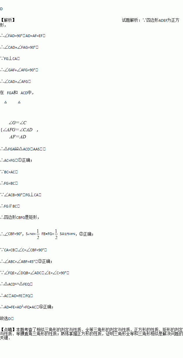 如图,CB=CA,∠ACB=90°,点D在边BC上(与B,C不重合),四边形ADEF为正方形,过点F作FG⊥CA,交CA的延长线于点G,连接FB,交DE于点Q,给出以下结论:①AC=FG;②S△FAB∶S四边形CBFG=1∶2;③∠ABC=∠ABF;④AD2=FQ·AC,其中正确结论的个数是( )