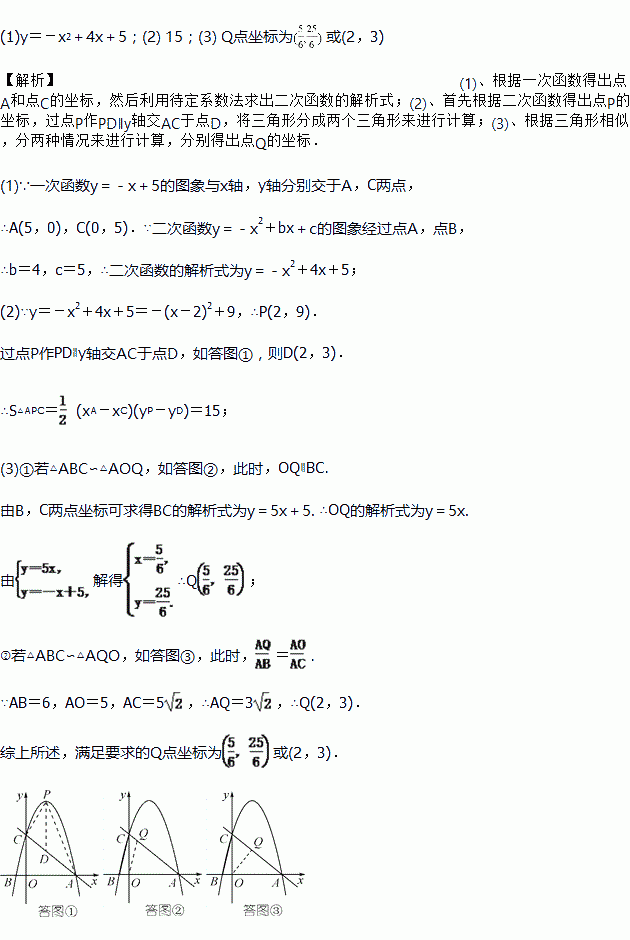 如图,平面直角坐标系xOy中,已知B(-1,0),一次函数y=-x+5的图象与x轴,y轴分别交于点A,C两点,二次函数y=-x2+bx+c的图象经过点A,点B.