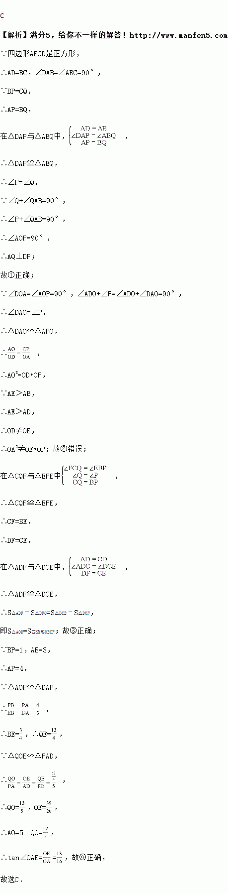如图,正方形ABCD的边长是3,BP=CQ,连接AQ,DP交于点O,并分别与边CD,BC交于点F,E,连接AE,下列结论:①AQ⊥DP;②OA2=OE•OP;③S△AOD=S四边形OECF;④当BP=1时,tan∠OAE=