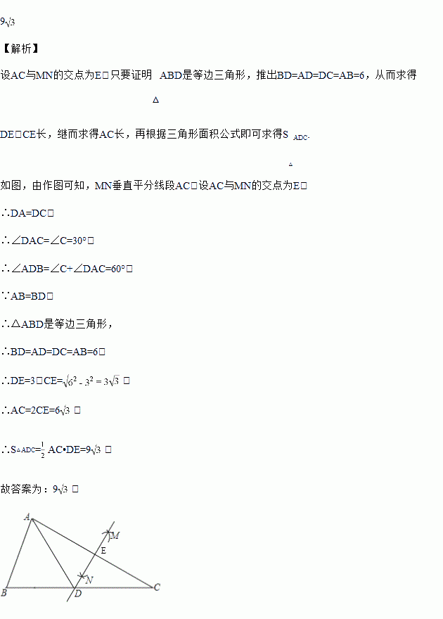 AC的长为半径作弧,两弧相交于M、N两点;②作直线MN交BC于点D,连接AD.若AB=BD,AB=6,∠C=30°,则△ACD的面积为_____.