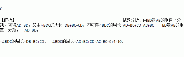 △ABC中,AB = 5,AC = 6,BC = 4,边AB的垂直平分线交AC于点D,则△BDC的周长是( )