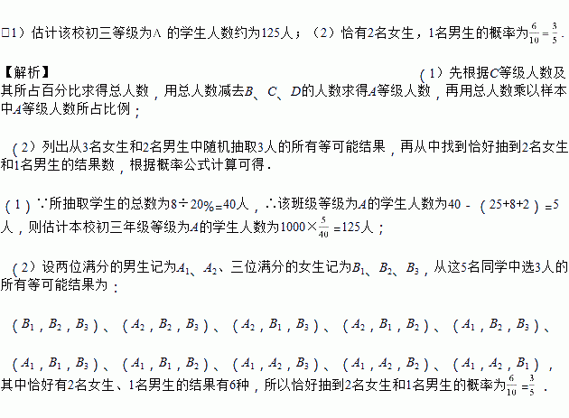 (2)学校决定从得满分的3名女生和2名男生中随机抽取3人参加市级比赛,请求出恰好抽到2名女生和1名男生的概率.