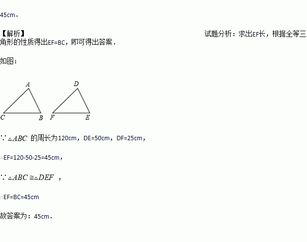 已知△ABC≌△DEF,△ABC的周长为120 cm,DE=50cm,DF=25cm,那么 BC=_______.