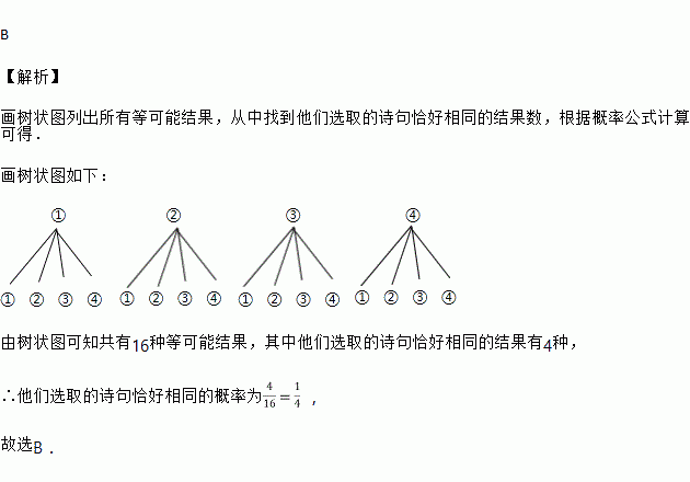 床前明月光,甲、乙两名同学从中各随机选取了一句写在了纸上,则他们选取的诗句恰好相同的概率为![]()