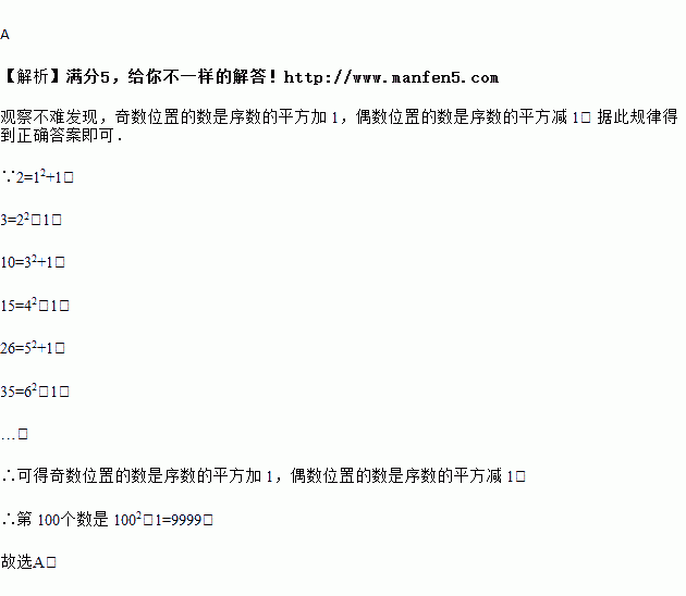 按一定规律排列的一列数依次为:2,3,10,15,26,35,…,按此规律排列下去,则这列数中的第 100 个数是( )