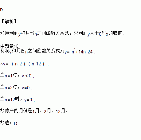 黄山市某塑料玩具生产公司,为了减少空气污染,国家要求限制塑料玩具生产,这样有时企业会被迫停产,经过调研预测,它一年中每月获得的利润y(万元)和月份n之间满足函数关系式y=﹣n2+14n﹣24,则企业停产的月份为(  )
