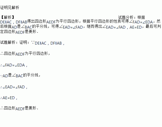 如图,在△ABC中,AD是∠BAC的平分线,DE∥AC交AB于E,DF∥AB交AC于F,求证:四边形AEDF是菱形.